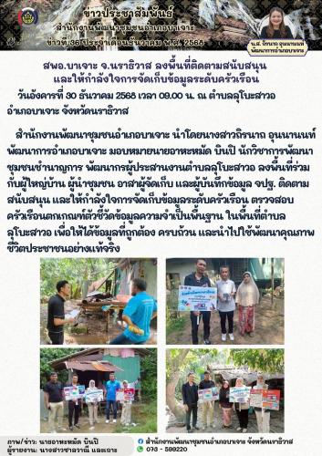 สำนักงานพัฒนาชุมชนอำเภอบาเจาะ นำโดยนางสาวถิรนาถ อุนนานนท์ พัฒนาการอำเภอบาเจาะ มอบหมายนายอาหะหมัด บินปิ นักวิชาการพัฒนาชุมชนชำนาญการ พัฒนากรผู้ประสานงานตำบลลุโบะสาวอ ลงพื้นที่ร่วมกับผู้ใหญ่บ้าน ผู้นำชุมชน อาสาผู้จัดเก็บ และผู้บันทึกข้อมูล จปฐ. ติดตาม สนับสนุน และให้กำลังใจการจัดเก็บข้อมูลระดับครัวเรือน ตรวจสอบ ครัวเรือนตกเกณฑ์ตัวชี้วัดข้อมูลความจำเป็นพื้นฐาน ในพื้นที่ตำบลลุโบะสาวอ เพื่อให้ได้ข้อมูลที่ถูกต้อง ครบถ้วน และนำไปใช้พัฒนาคุณภาพชีวิตประชาชนอย่างแท้จริง