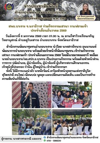 สำนักงานพัฒนาชุมชนอำเภอบาเจาะ นำโดย นางสาวถิรนาถ อุนนานนท์ พัฒนาการอำเภอบาเจาะ พร้อมด้วยเจ้าหน้าที่พัฒนาชุมชน เข้าร่วมกิจกรรมเสวนา กาแฟยามเช้า ประจำเดือนมกราคม 2569 โดยมีนายมาหะมะยากี หะยีมะ